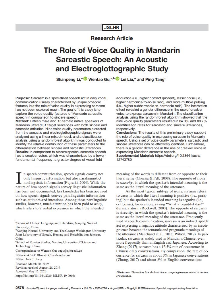 我院顾文涛教授主持的语音学研究团队于今年8月在SSCI语言学一区期刊Journal of Speech, Language and Hearing Research上发表了论文Therole of voice quality in Mandarin sarcastic speech: An acoustic and electroglottographic study(嗓音音质在汉语反讽话语中的作用:基于声音与电子声门仪信号的研究)。论文第一作者为我院博士生李善鹏,通讯作者为顾文涛教授,该研究受国家社科基金重大项目“社会情感的语音生成与认知的跨语言跨文化研究”等资助。
