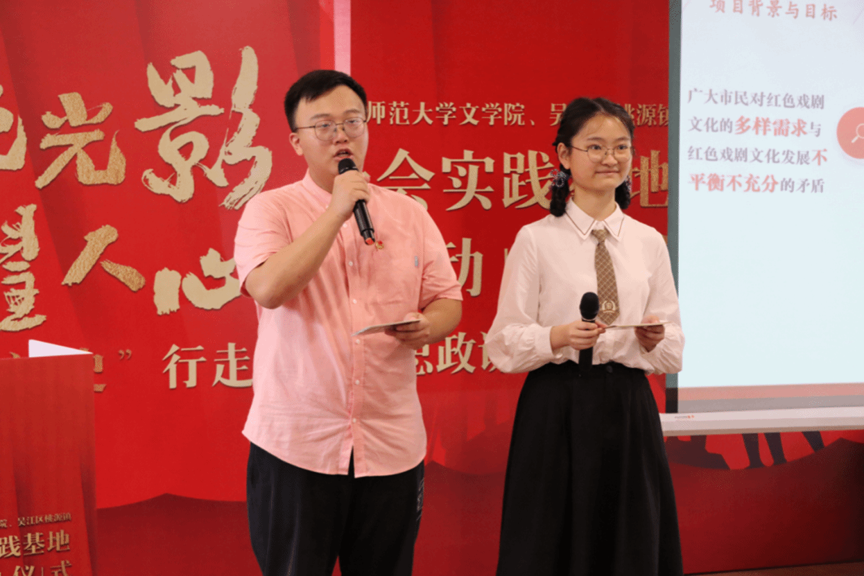 社会实践团队学生代表展示了“赤色光影,永耀人心”社会实践项目。下一步,该项目将围绕“一条路”“一节课”“一台戏”,与桃源镇合作开展红色研学、赤色光影微课堂、红色戏剧“下乡进校”等活动,为桃源爱国主义教育增添更多鲜活、灵动的资源。