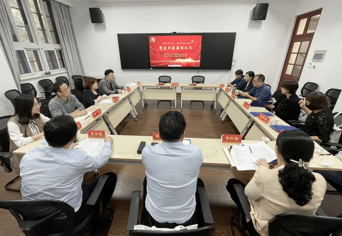 随后的党建共建签约仪式在中大楼114会议室举行,我院教工第五党支部书记胡明波老师主持签约仪式并对出席活动的嘉宾表示欢迎,他详细介绍了教工第五党支部的基本情况、党建工作亮点及成果。联合党总支副书记陈诚介绍了联合党总支的基本情况、党建工作特色及成效,她表示,第一次走进百年名校,心情激动之余更对未来的合作满怀憧憬与期待。
