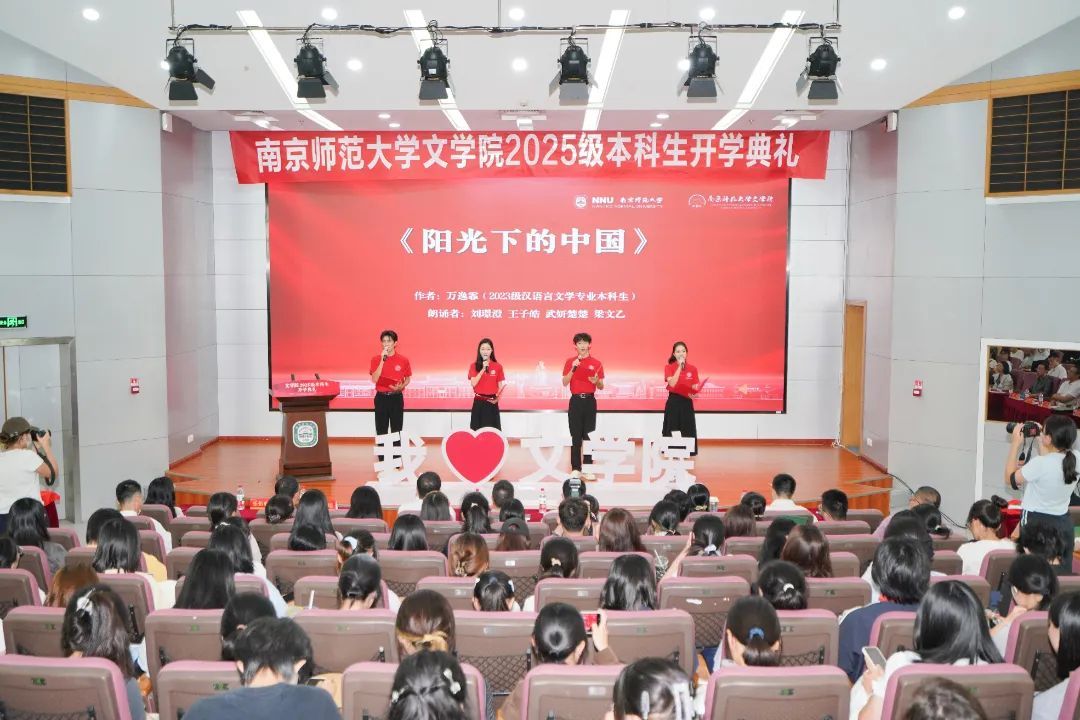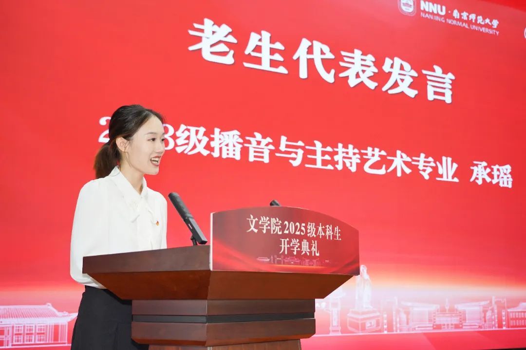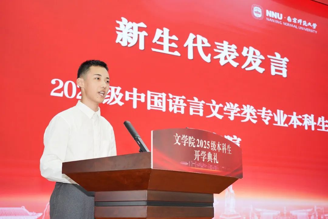 新生代表、2025级中国语言文学类专业秦宏暄同学作为新生代表发言,向大家分享了他家三代人与南师的深厚情缘,表达了从“向往者”成为“文院人”的激动与使命感。他表示,对文学深沉的热爱与对百年学府精神气质的追寻,是驱动大家相聚于此的共同答案,作为av视频