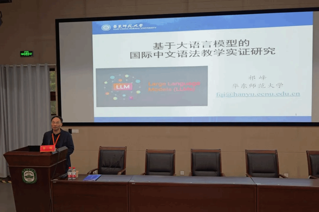 工作坊后继续进行大会主旨报告。 华东师范大学祁峰教授作《基于大语言模型的国际中文语法教学实证研究》报告,展示大语言模型在国际中文教育中的应用成效。