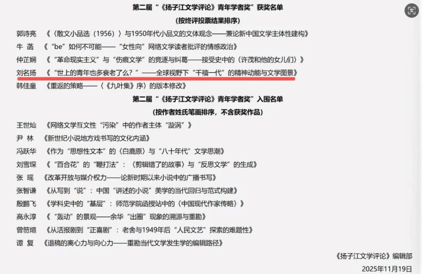 11月19日,第二届“《扬子江文学评论》青年学者奖”获奖名单出炉。av视频