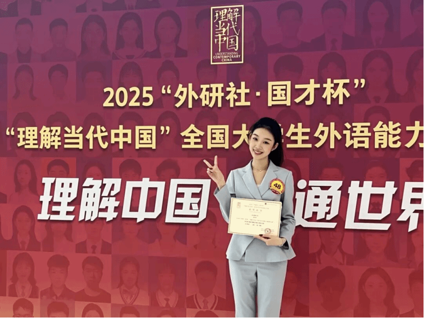 2025年12月6日-12月8日,“外研社·国才杯”“理解当代中国”全国大学生外语能力大赛决赛在北京外国语大学成功举办,该比赛由北京外国语大学主办,外语教学与研究出版社承办,由CGTN、新华网、“学习强国”学习平台、人民网+、中国教育电视台、中国教育报、中国新闻出版广电网、环球网、百通网多家媒体支持。此次比赛中,我院2024级播音与主持艺术专业本科生张昱清获英语组国际传播综合能力赛项全国金奖,充分展现了我院青年学子在国际传播领域的自信风采。