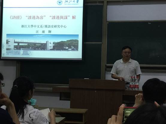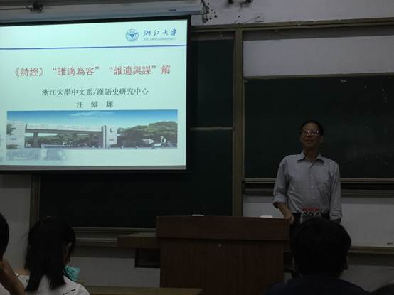 汪维辉教授的讲座于下午1:30开始,讲座的题目为《<诗经>“谁适为容”“谁适与谋”解》。汪先生在讲座中主要讨论了《诗经》中“谁适为容”“谁适与谋”中“适”的释义以及这两句话的语义。在参考前人意见的基础上,汪先生广泛查阅传世文献与出土文献,最后得出结论:这两个“适”皆为语助词,没有词汇意义,但有语法意义——提前宾语,另外,这两个“适”可以起到补足音节的作用。汪先生指出:“谁适为容”“谁适与谋”正常的语序皆应为“为谁容”“与谁谋”;“适”与“之”的关系很密切,可能是方言同源词。