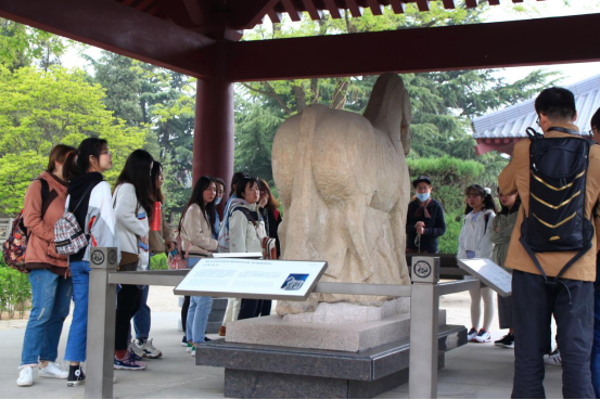 9日,我们参观了西安碑林博物馆及半坡遗址。西安碑林博物馆是我国收藏碑石时间最早、数量最大的一座艺术宝库。作为古文献学子,碑林是我们心中的圣地,当然也是我们重点考察的对象。我们在碑林讲解员的带领下,主要参观了第一至四展室及石刻艺术馆。第一展室陈列唐《开成石经》,包括《周易》《尚书》《诗经》《周礼》《仪礼》《礼记》《春秋左氏传》《春秋公羊传》《春秋穀梁传》《论语》《孝经》《尔雅》以及《五经文字》《九经字样》,另有清代补刻的《孟子》。同学们对着石碑品读经典,仿佛看到了千年前孜孜求学的文人学士们的身影。第二至四展室主要是书法名碑,荟聚了虞世南、褚遂良、张旭、颜真卿、柳公权等书法圣手的墨迹。比如二展室的《多宝塔碑》《颜氏家庙碑》及三展室的《颜勤礼碑》这三个驰名中外的书法瑰宝,使我们窥见了颜真卿的书学境界。石刻艺术馆里的东汉双兽、汉画像石砖、唐李寿石椁及墓志、昭陵六骏等,雕刻手法多样、风格各异,是不同历史时期石刻艺术中的精品。半坡博物馆主要展示了距今五六千年的古人遗迹。从房屋遗址、圈栏、洞穴、陶窑、墓葬及生产生活工具中,我们了解了半坡人的衣、食、住、行。从利用重力汲水的双耳罐中,我们看到了古人的智慧。从人面鱼纹盆、鹿纹盆、人头壶、人面鸟头纹瓶等彩陶文物中,我们感受到了半坡人的审美旨趣。