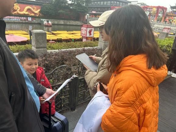 团队首站来到夫子庙秦淮风光带。正值白日晴好,阳光洒在波光粼粼的秦淮河面上,河畔游人络绎不绝,欢声笑语此起彼伏。团队成员穿梭于熙熙攘攘的人群中,感受着这座六朝古都的繁华气息。