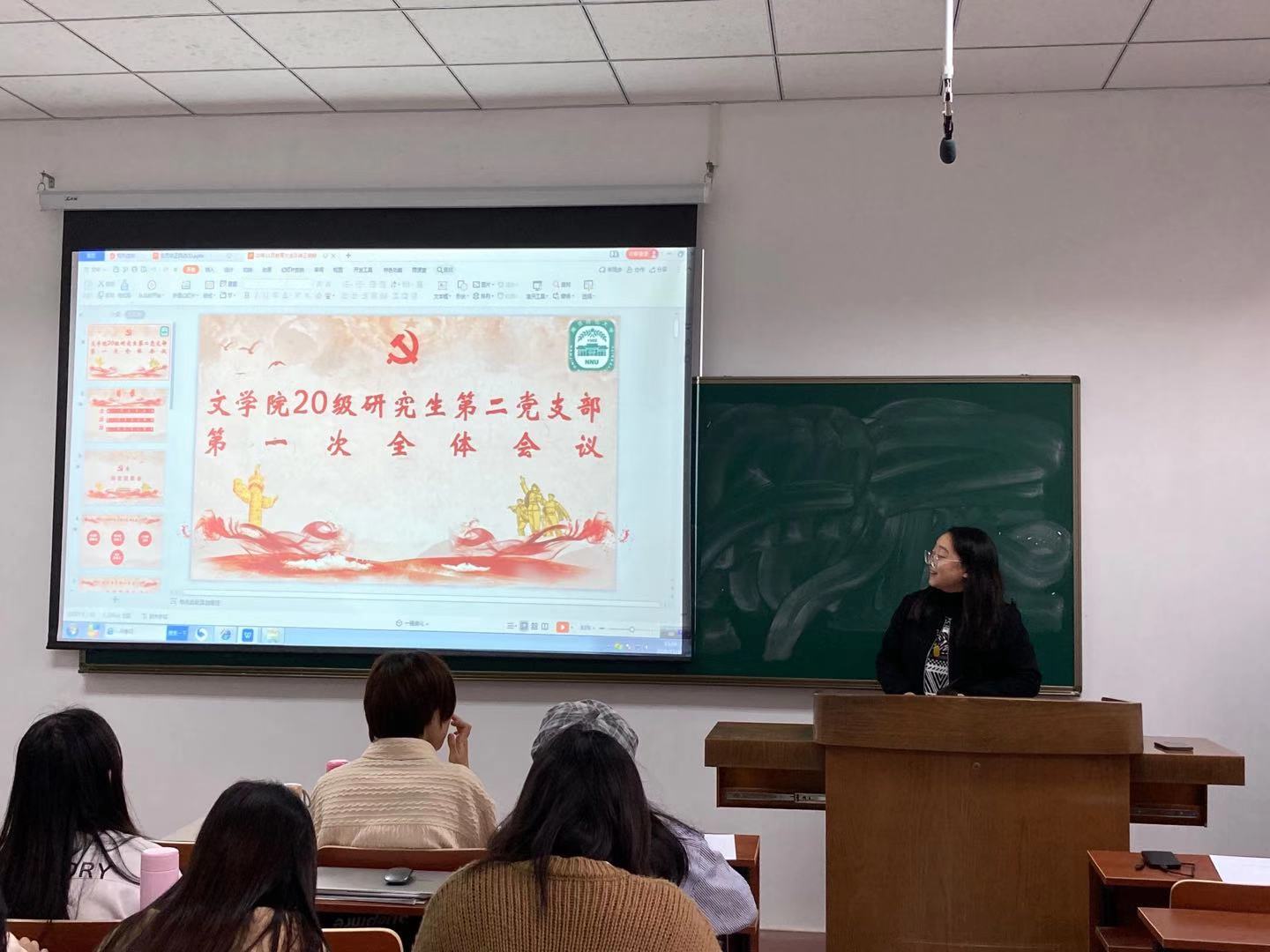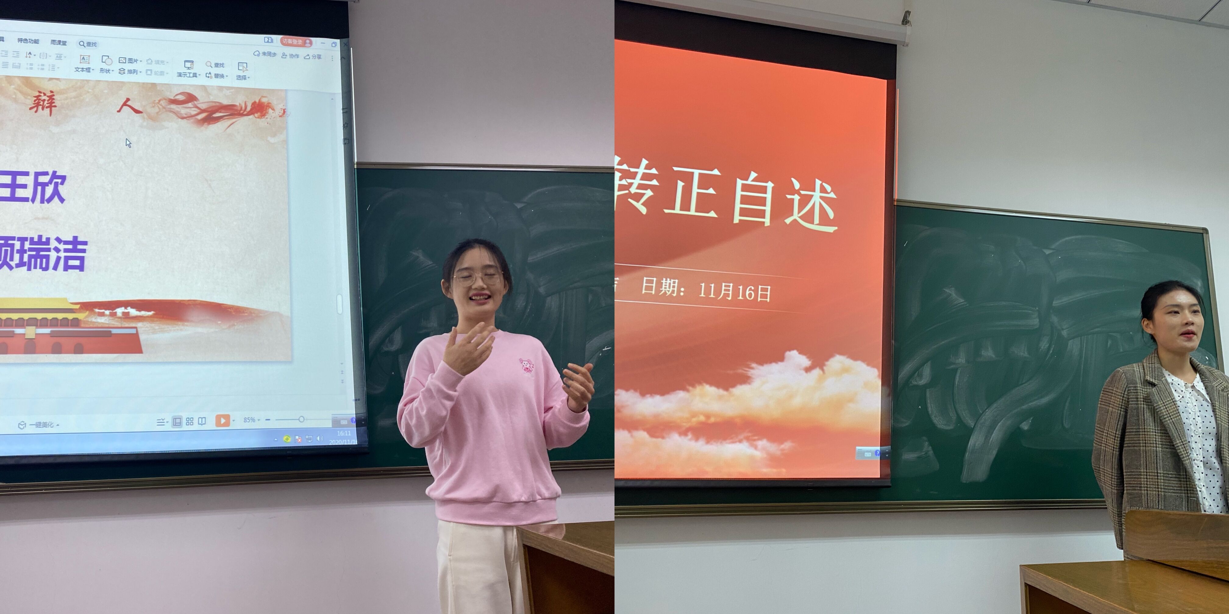 接着两名预备党员同学分别上台进行转正答辩。王欣同学语言风趣、颜瑞洁同学准备充分。两位同学在答辩环节进行了自我总结,陈述了自己为成为一名合格党员所作的贡献和努力,获得了在场同学们认可的掌声。