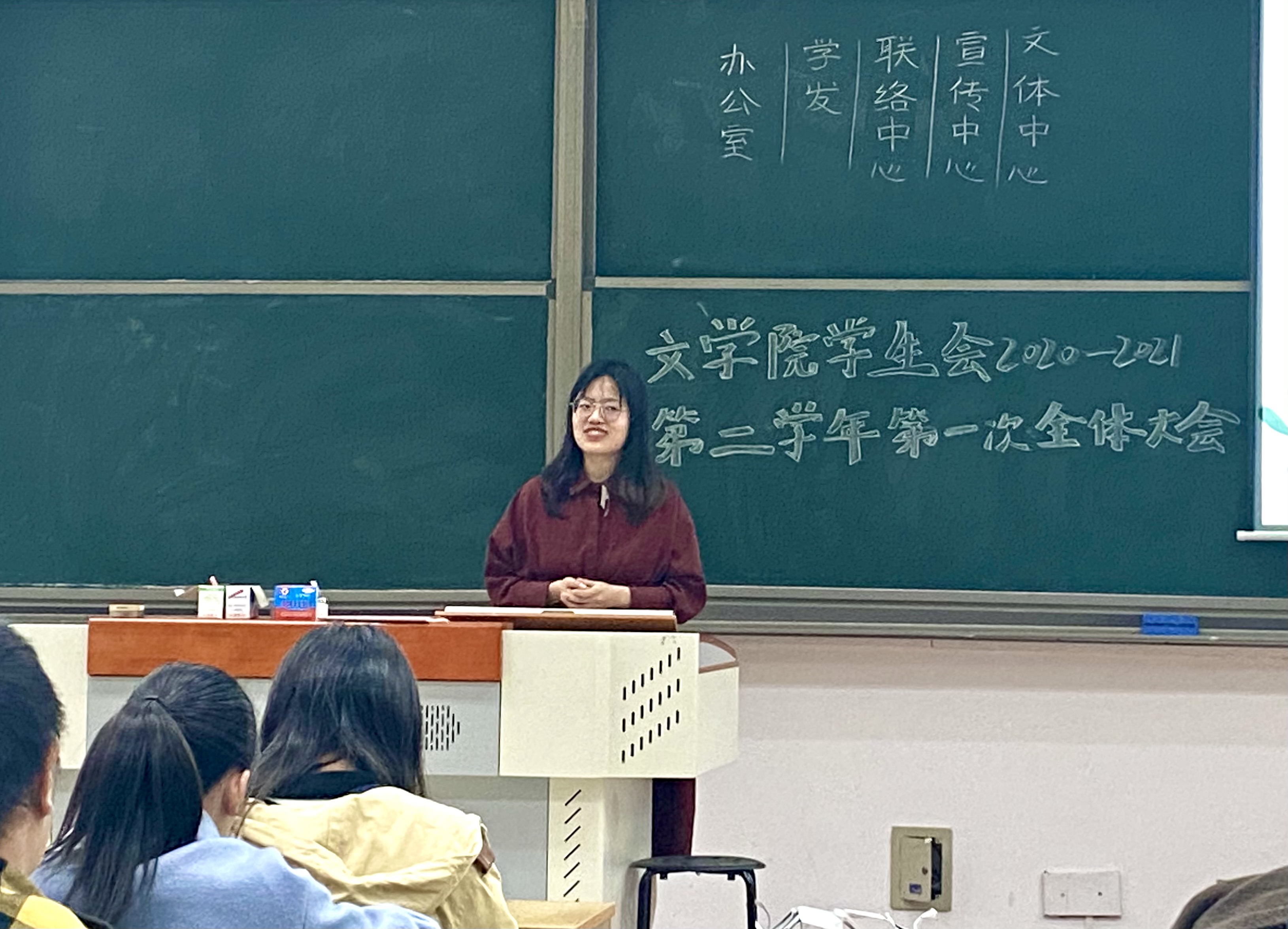 首先,由办公室副主任黄辰妍、学生发展中心主任张益诚、宣传中心主任杨丹、联络中心主任彭翰文、文体中心副主任王伊甜等五位部门主任对各部门开学以来的工作情况进行了总结,同时对各部门4月份的工作计划进行了报告。