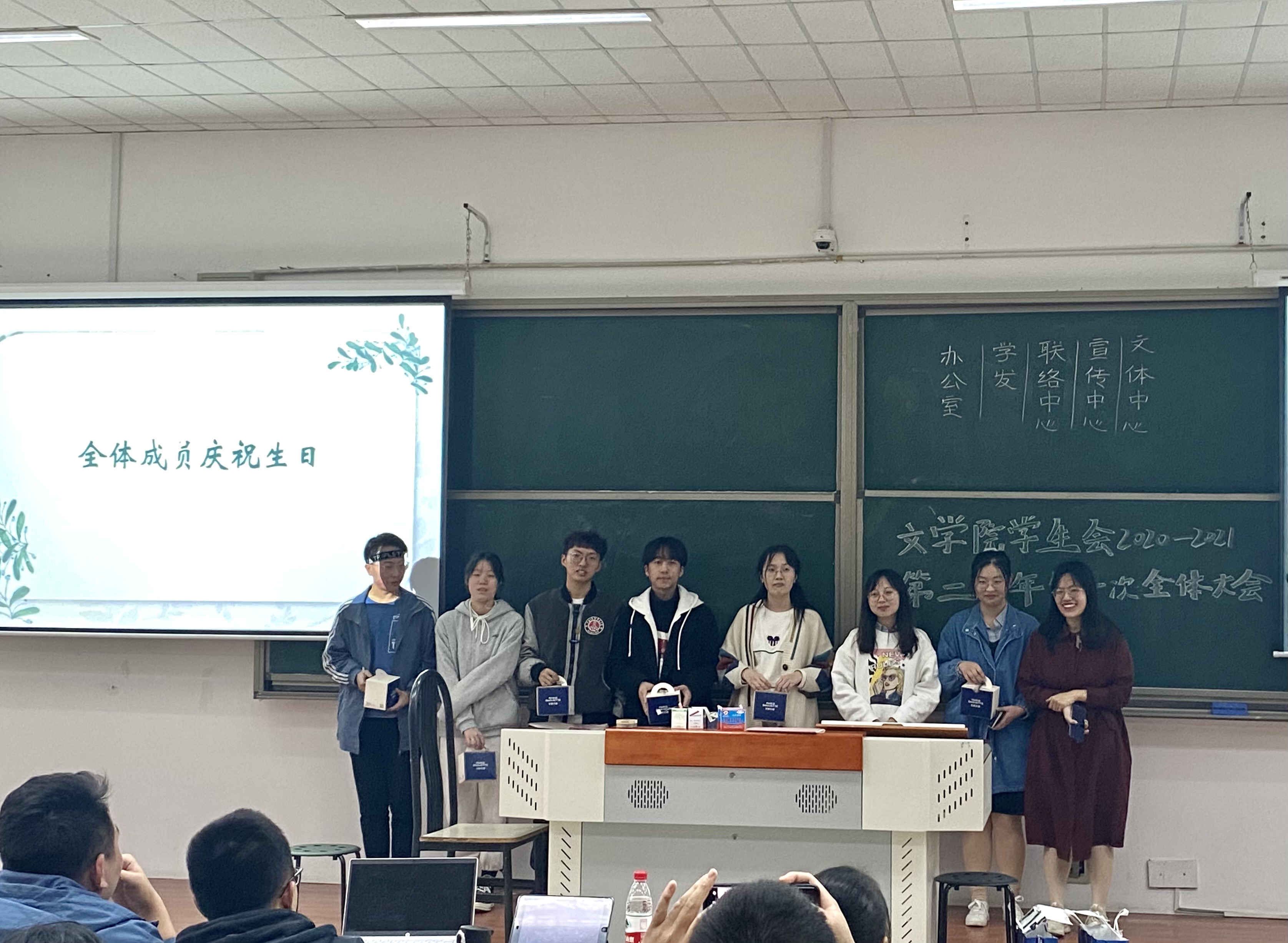 然后,学生会为4月份过生日的成员们准备了一份生日礼物——一份个人专属蛋糕。这个环节体现了学生会对成员们的关爱,增进了学生会的凝聚力与向心力。