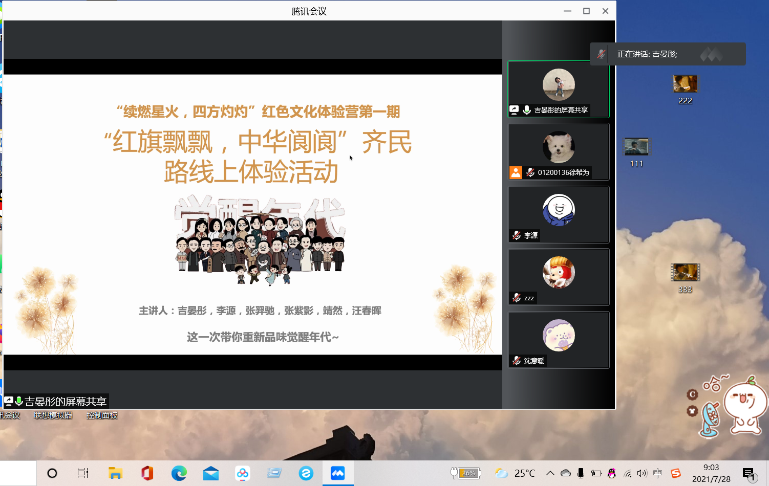 文欣青协“续燃星火,四方灼灼”暑期实践团队同齐民路社区和百水芊城社区共同开展了“续燃星火,四方灼灼”红色文化体验营系列活动。据悉,这一红色文化体验营初步以觉醒年代为主题开展实践活动,并氛围线上与线下两部分。但由于南京疫情反扑的影响,原定的四次线下活动改为线上通过腾讯会议来进行。该系列活动得到了家长,孩子们以及各负责人的广泛欢迎与关注。