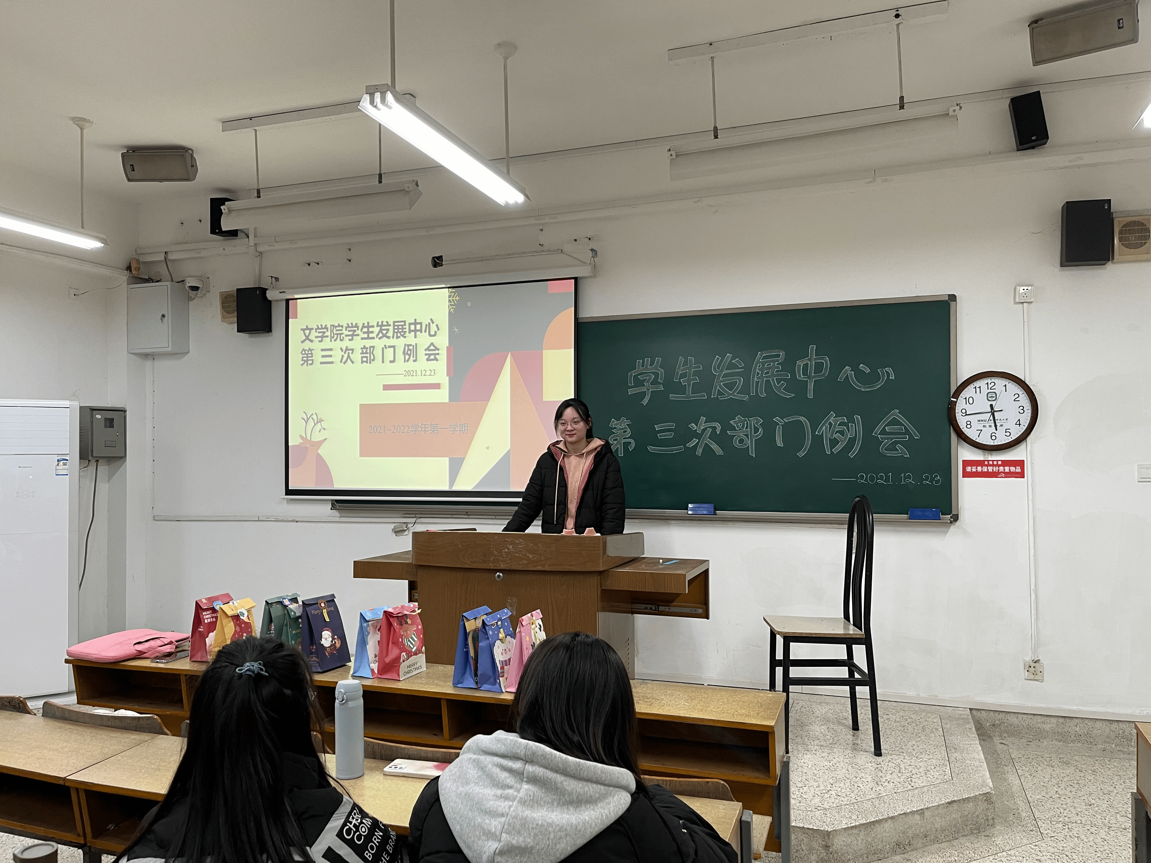 首先,主任鲁静晗进行了本学期部门主要工作的总结。本学期,学生发展中心除了综合测评审核工作以外,还举办了“青春艺文颂”线上朗读会、社团招新宣讲会、“文苑杯”新生辩论赛、综测方案讲解会、“十佳百优”班级风采展、优秀学子宣讲会、“学问思辨”系列讲座等活动。主任鲁静晗在回顾工作成果的同时,针对各项工作进行了经验总结和迁移,为以后工作改进提供了依据。